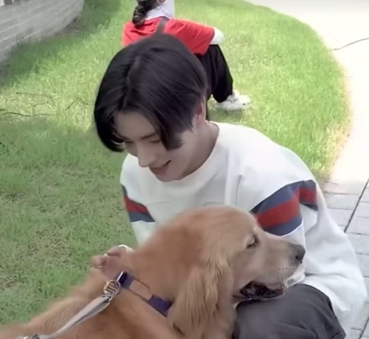 The scenes captured tender moments of the idol kneeling for hugs, cooing over the puppy on the grass, and even fanning it in a car with fellow member Jungwon to keep it cool.